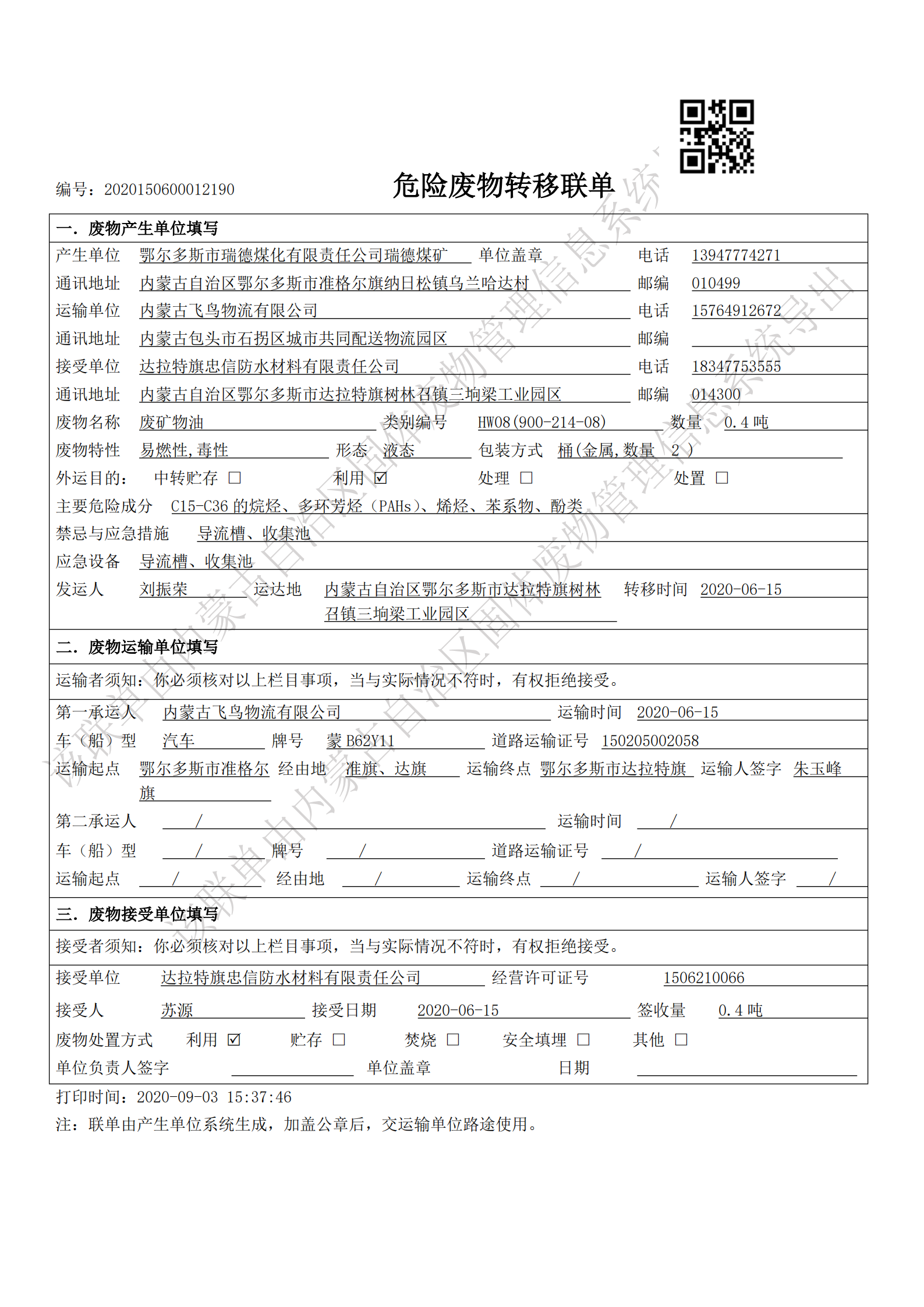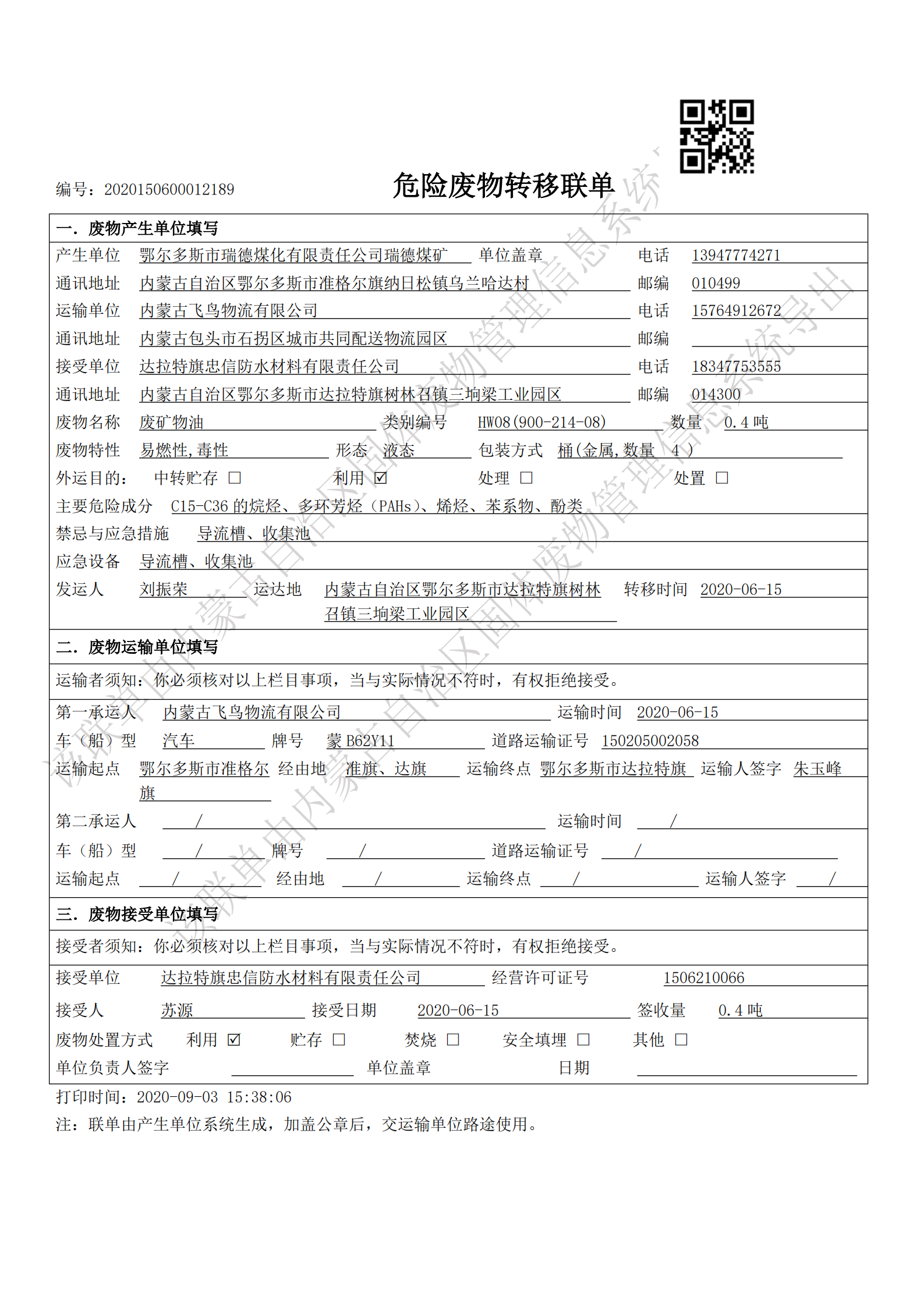 瑞德煤礦危險(xiǎn)廢物轉(zhuǎn)移聯(lián)單