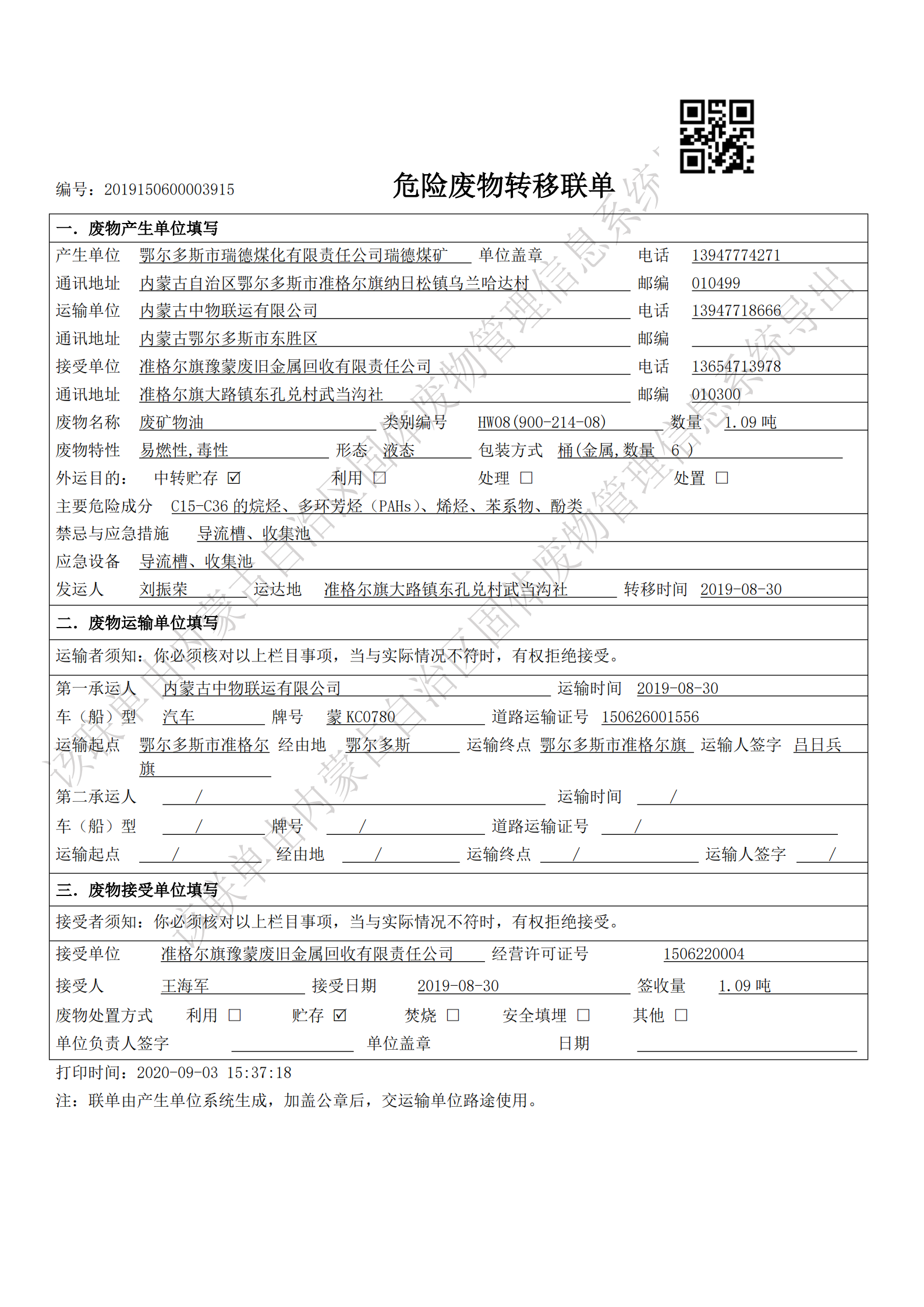 瑞德二礦危險(xiǎn)廢物轉(zhuǎn)移聯(lián)單